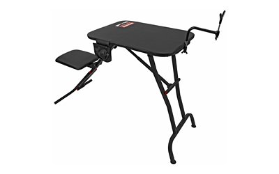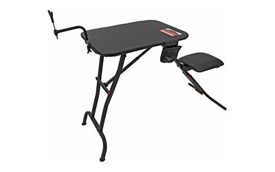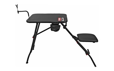 This ultra-steady shooting bench offers a stable, comfortable, and spacious shooting surface for target practice or field hunting. The 21″W X 28″L padded bench top provides comfort and a non-scratch surface protecting your gun, while also providing two additional gear pouches for ammunition or accessories. The gun rest is versatile to accommodate ambidextrous shooters and is adjustable to any position desired; also coated in durable non-scratch rubber. 12″W X 14″D X 1″ thick seat folds up. Folds flat for space saving storage and easy transport. The bench as a whole weighs a mere 32lbs. with a weight limit of 300lbs.