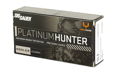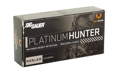 The Sig Sauer Platinum Hunter line of ammunition was created in partnership with the hunting experts at Meateater. This premium offering is precision-loaded with a Nosler Accubond projectile, delivering unmatched weight retention and deep penetration on big game. Each round is enclosed in a corrosion-resistant nickel case for smooth cycling, ensuring reliability in all conditions. And with waterproofing for extreme weather resistance, nothing will stop you from making the perfect shot.