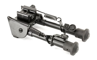 Designed for tactical shooting, these bipods are constructed of high tech durable aluminum with steel top platforms. The dual mounting design includes both a Picatinny and swivel stud mount to accommodate almost every type of rifle. The legs are fully adjustable for height, have non slip rubber feet, retract instantly with the quick retraction buttons, and lock out of the way with spring tension when not in use.